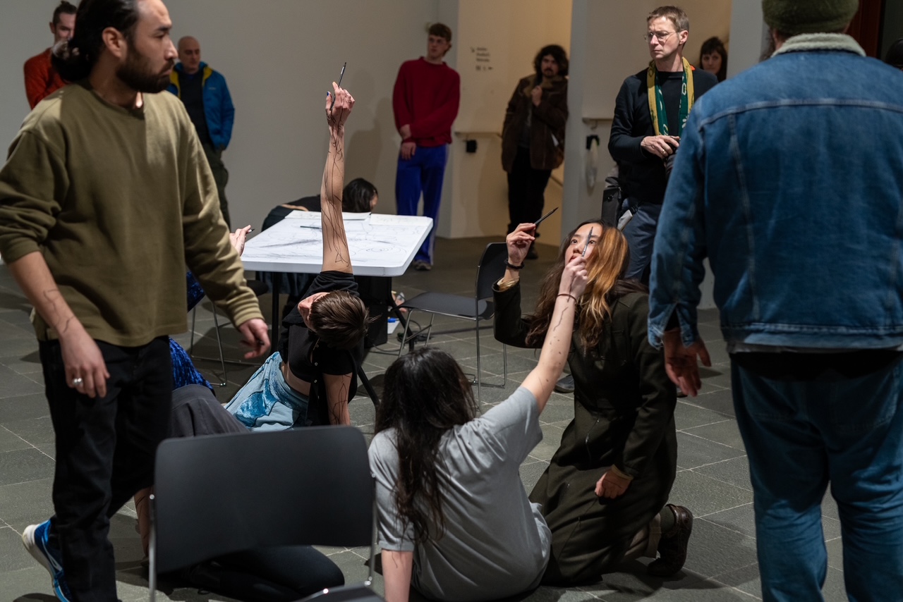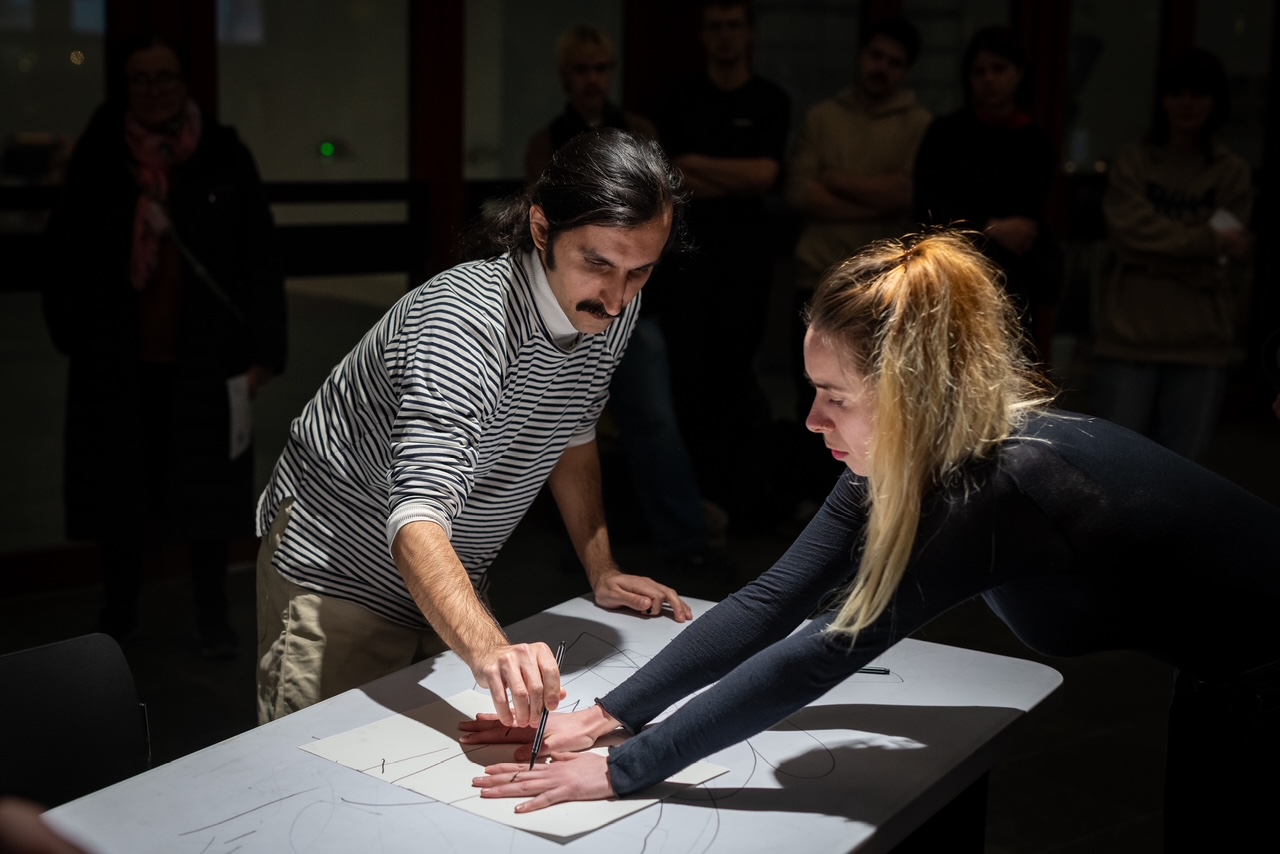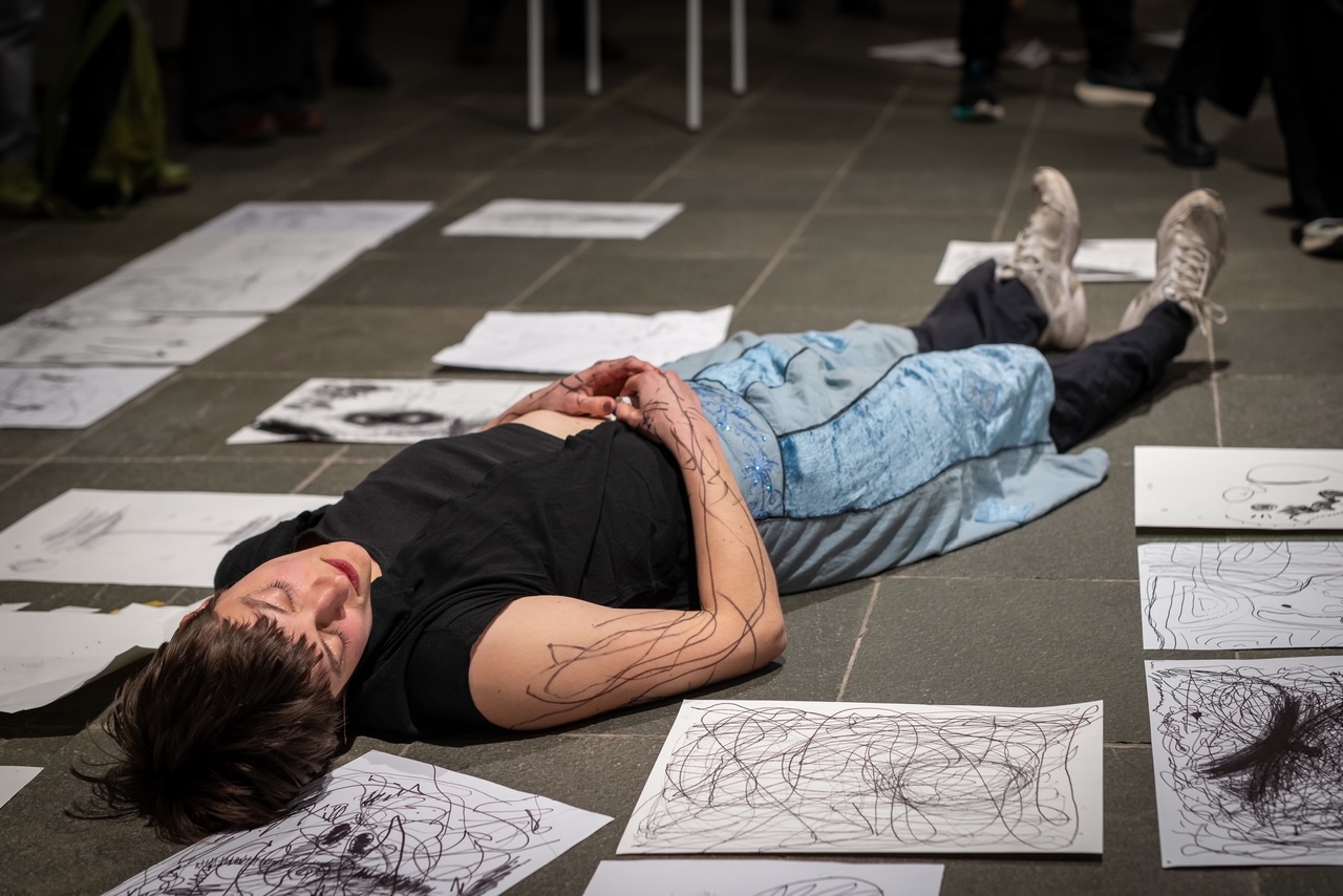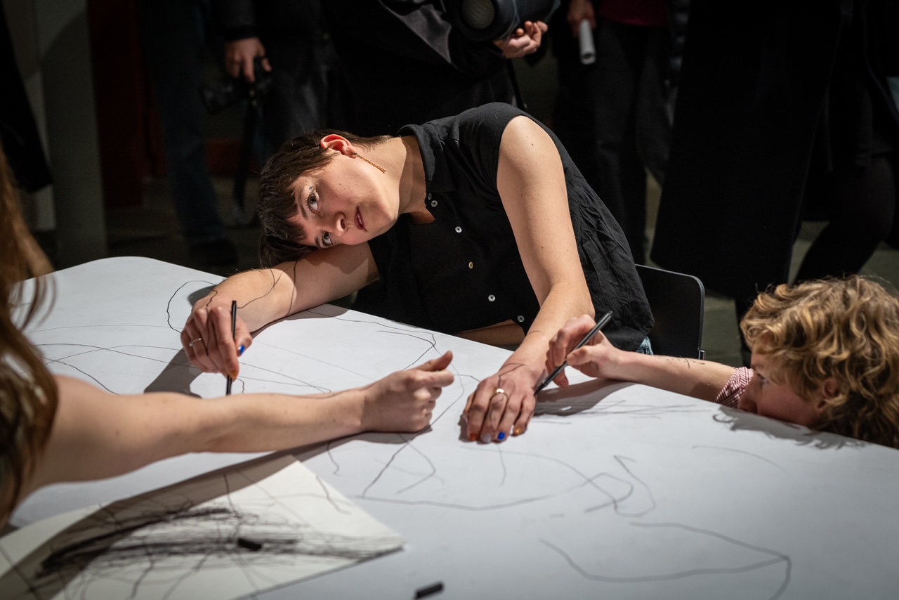 Michikazu Matsune and students of University of Arts Linz share their drawing performance practice—an exercise to make sense and nonsense at the crossroads between concrete and abstract, image and action, sound and movement. Ausgezeichnet! (Excellent!) is an act, in which everyone actively engages in communication, negotiation and co-creation.