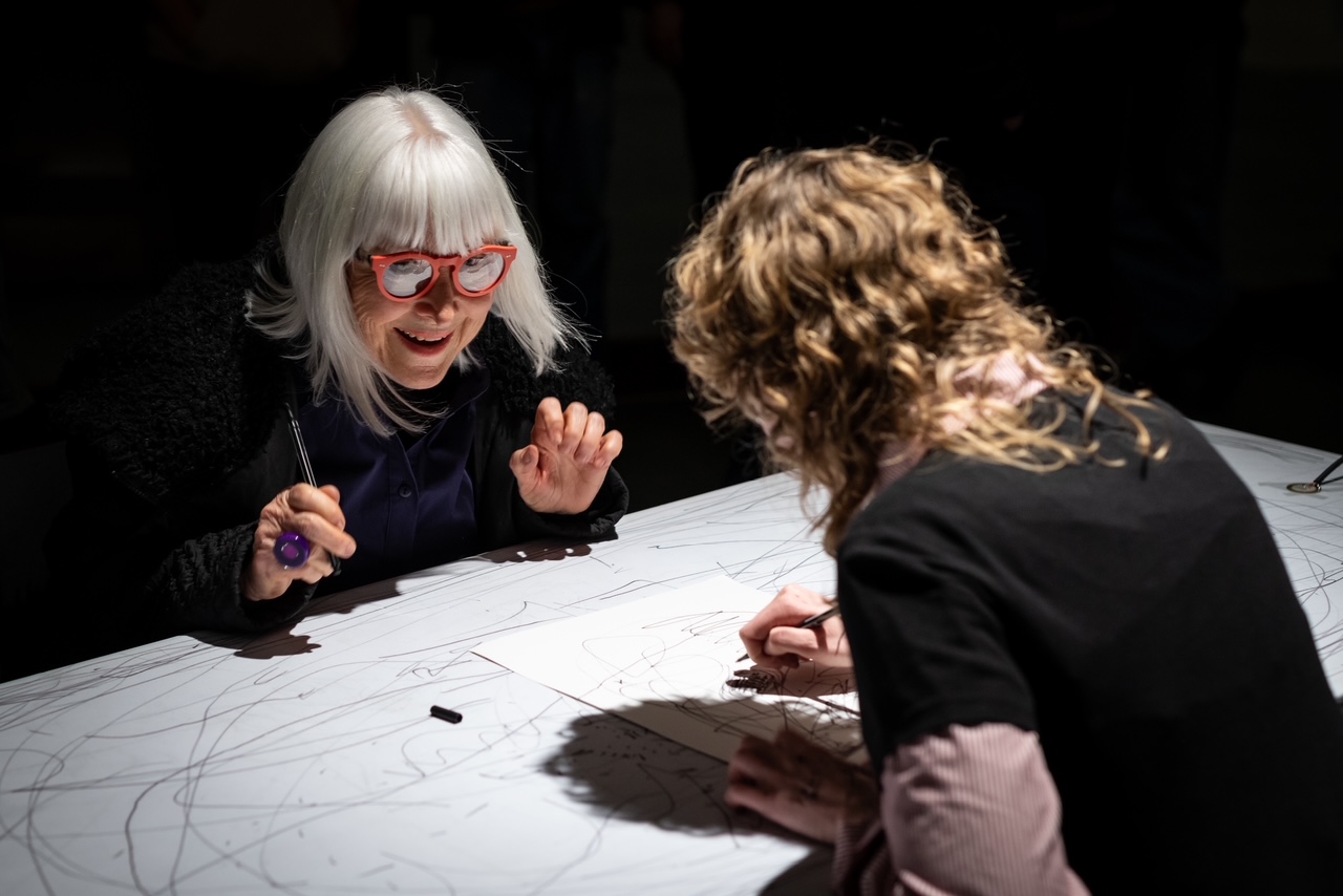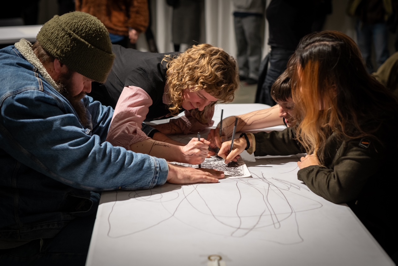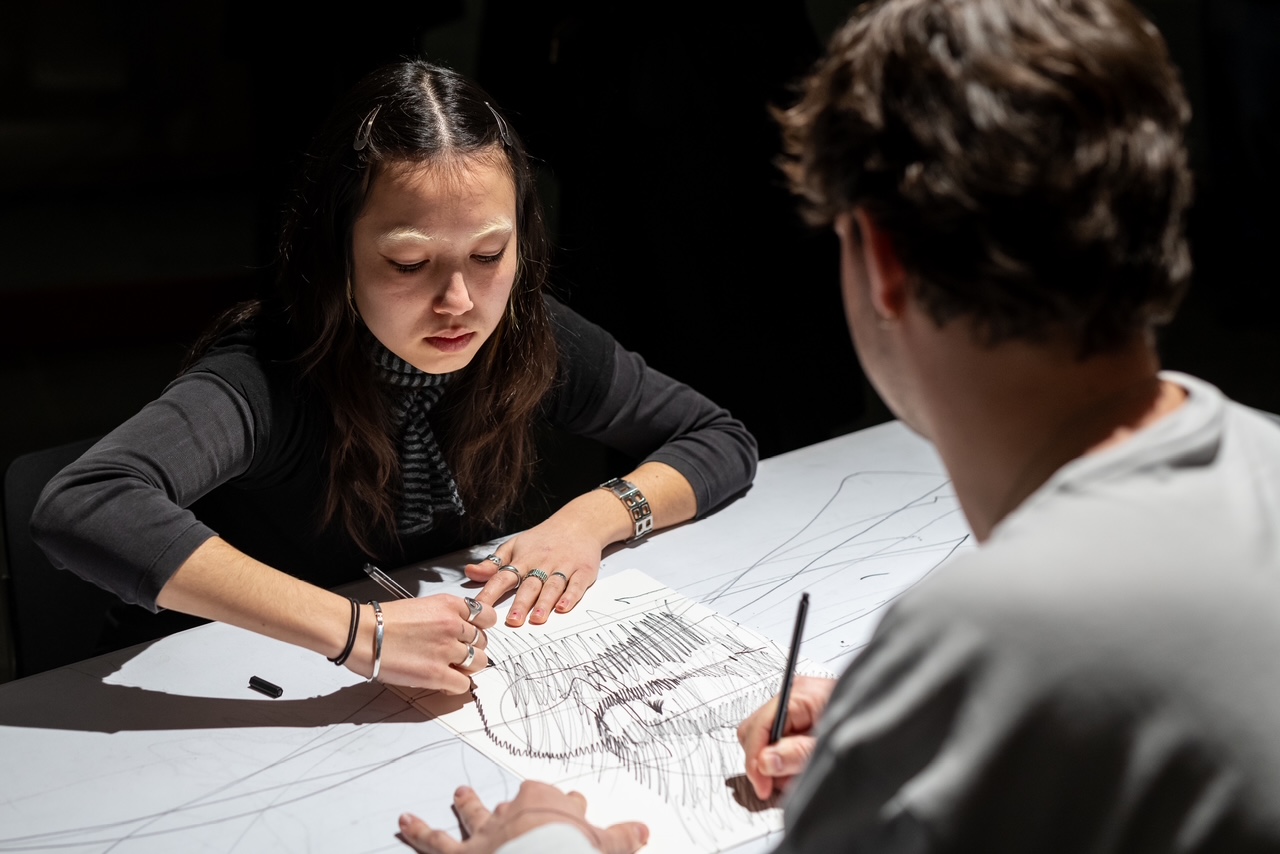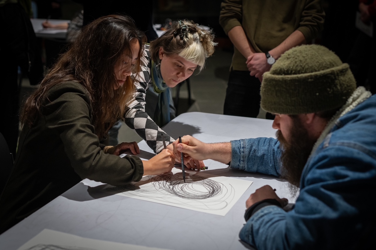 Michikazu Matsune and students of University of Arts Linz share their drawing performance practice—an exercise to make sense and nonsense at the crossroads between concrete and abstract, image and action, sound and movement. Ausgezeichnet! (Excellent!) is an act, in which everyone actively engages in communication, negotiation and co-creation.